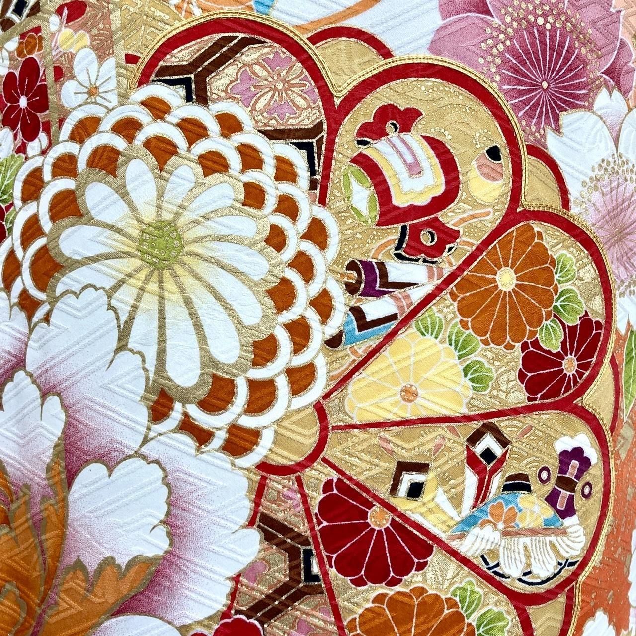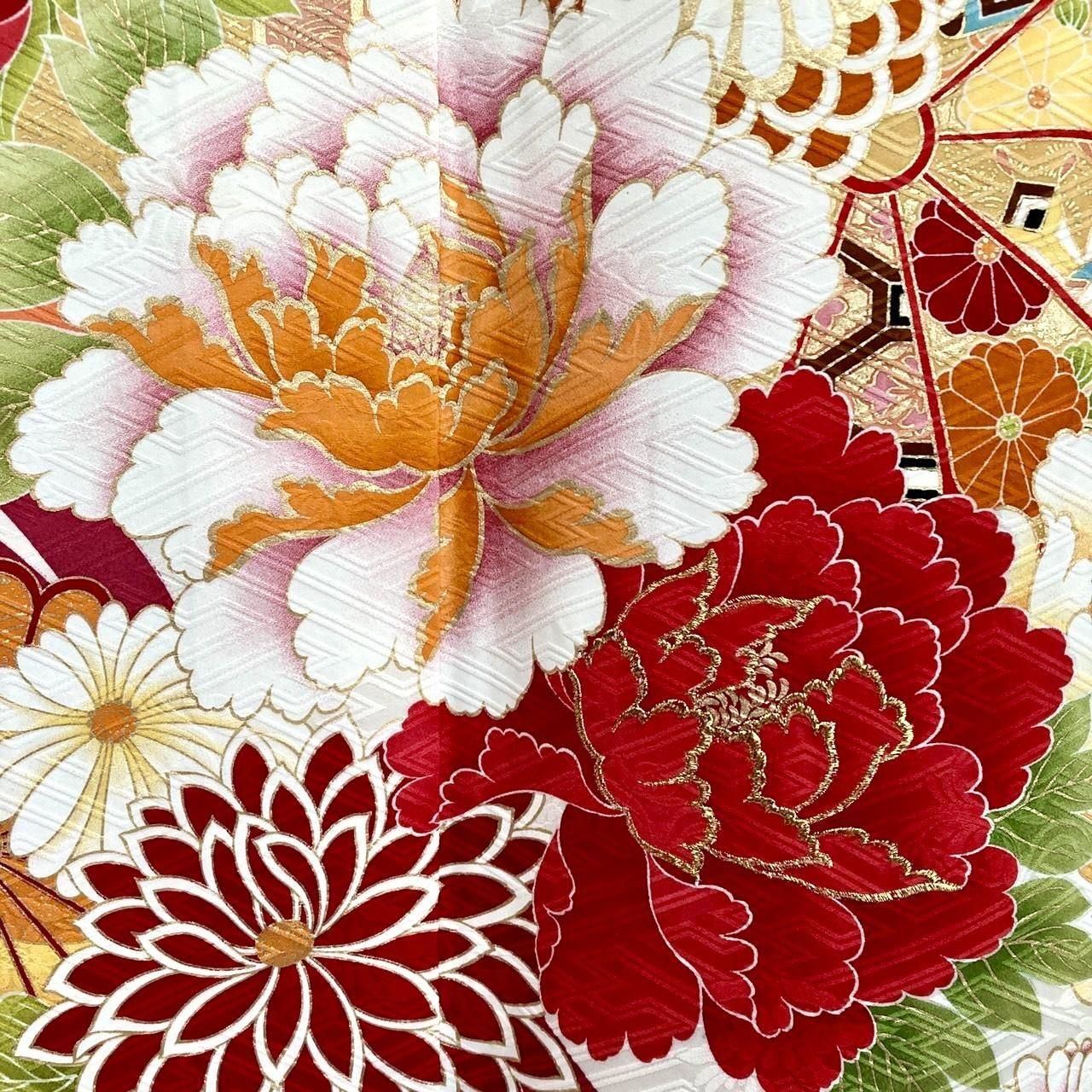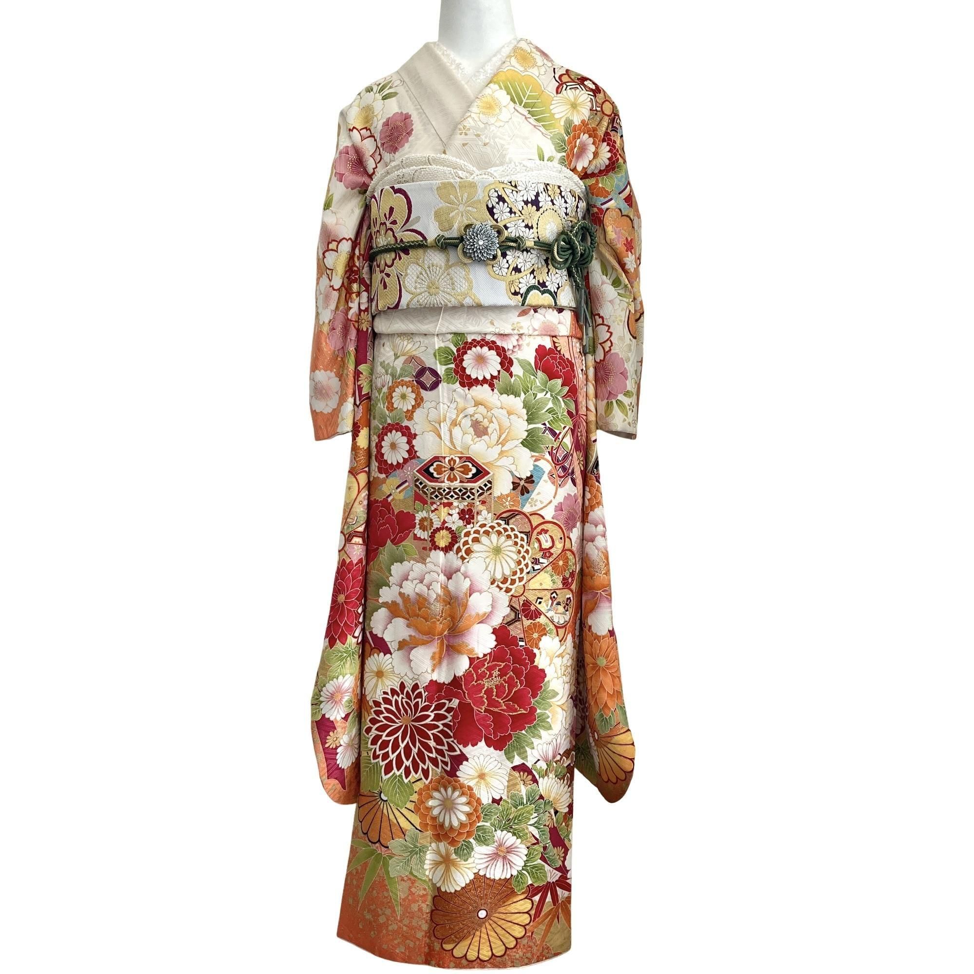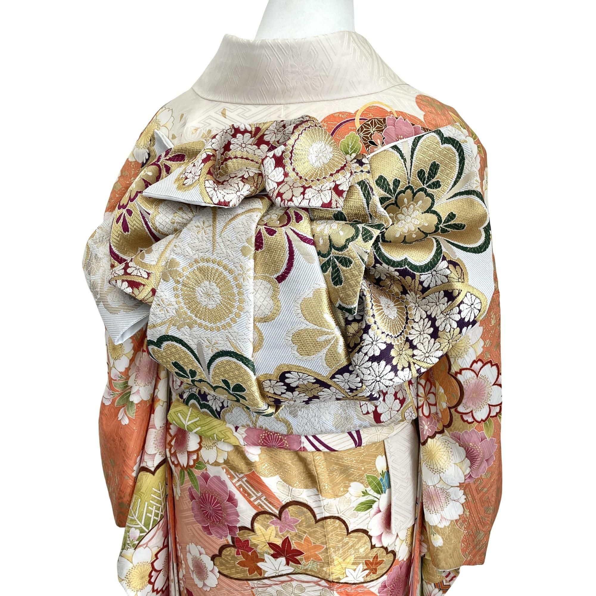 白とオレンジを基調に、牡丹や菊、宝尽くし、御所車などおめでたい文様を華やかにあしらった振袖です。