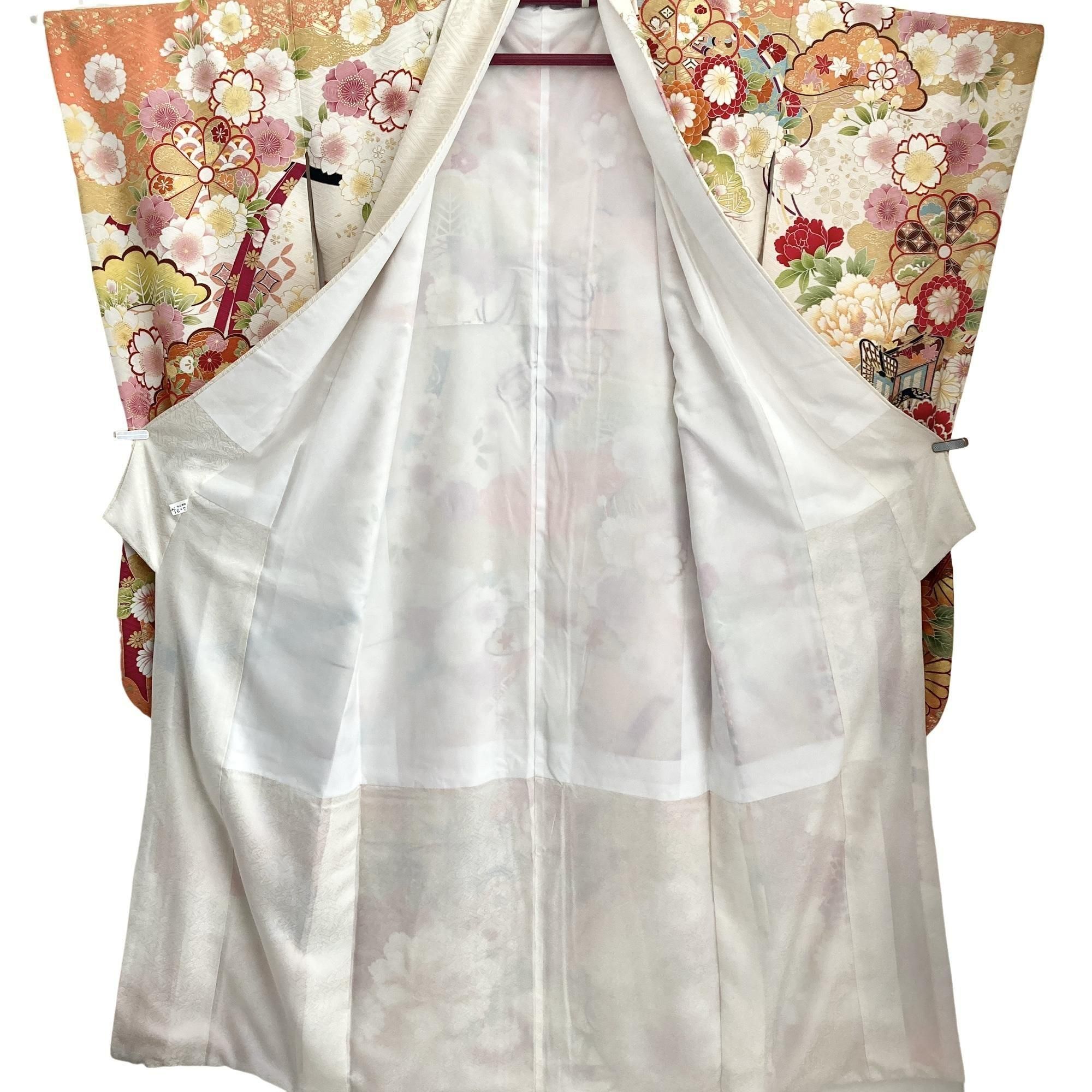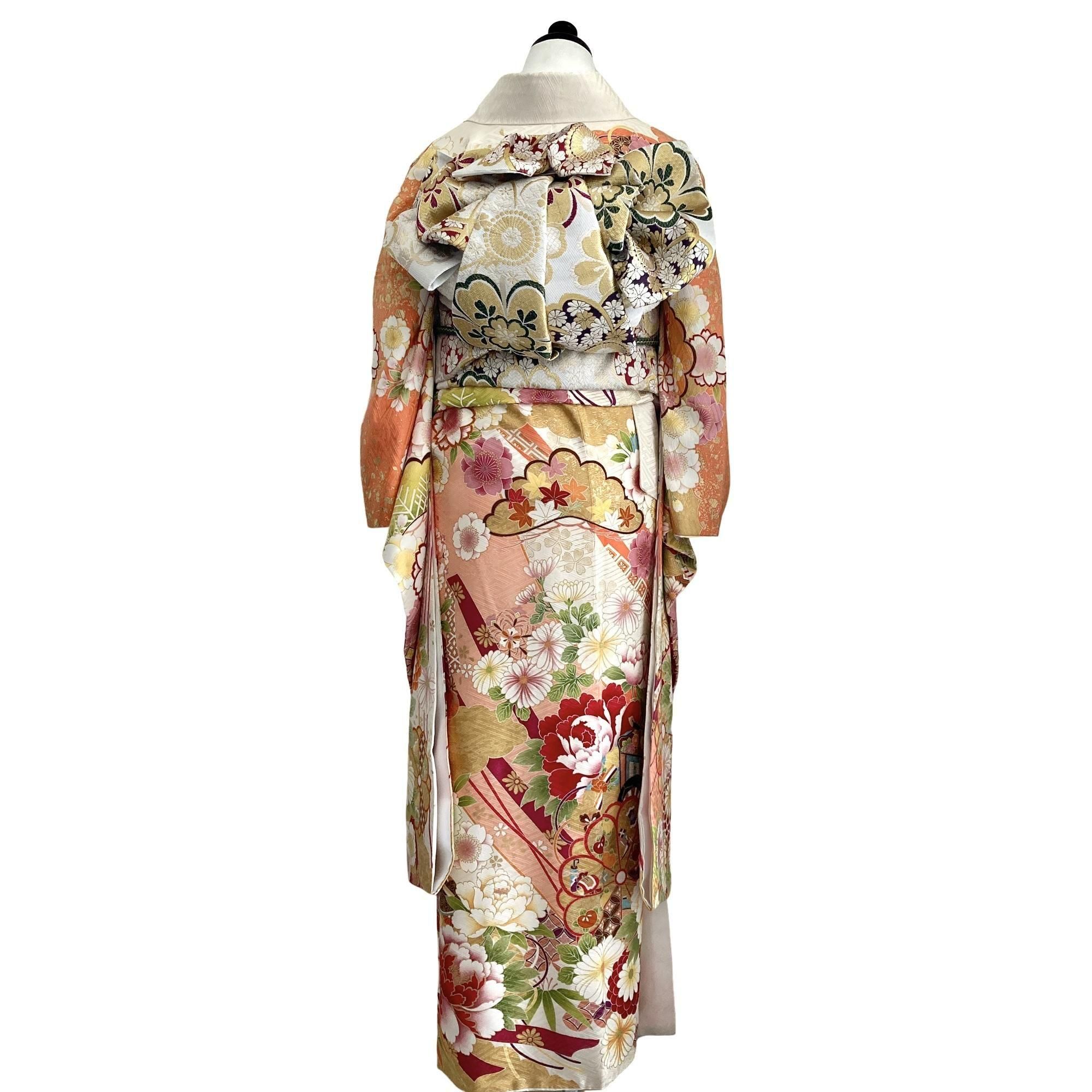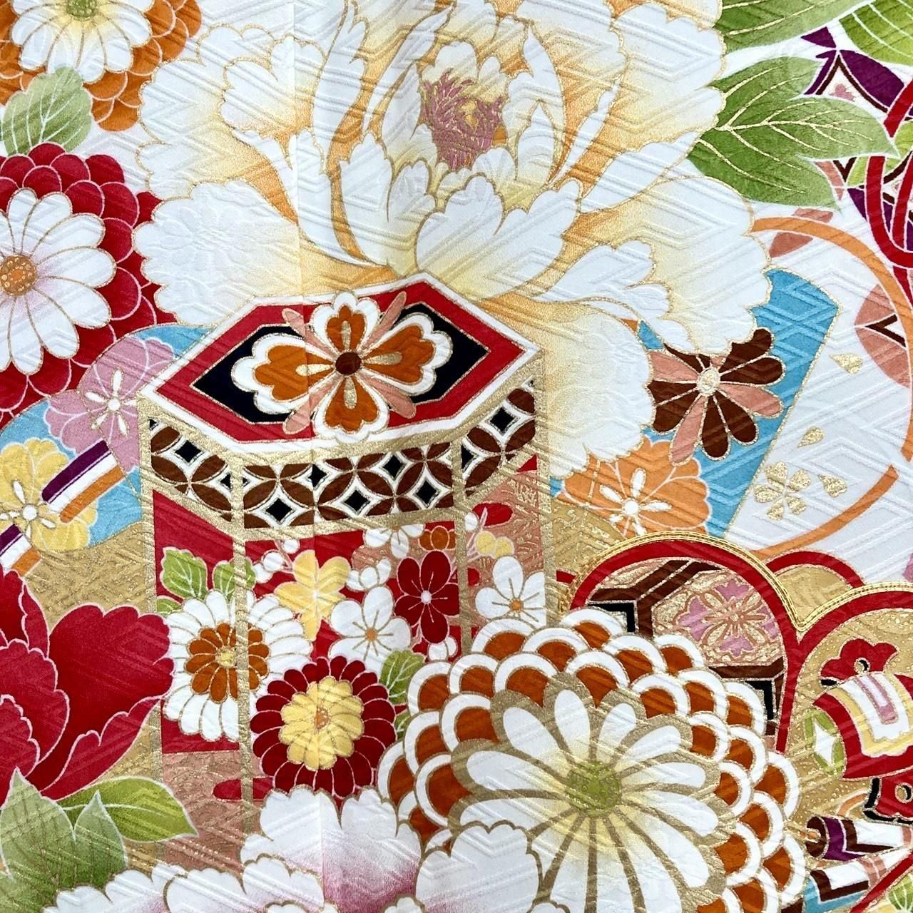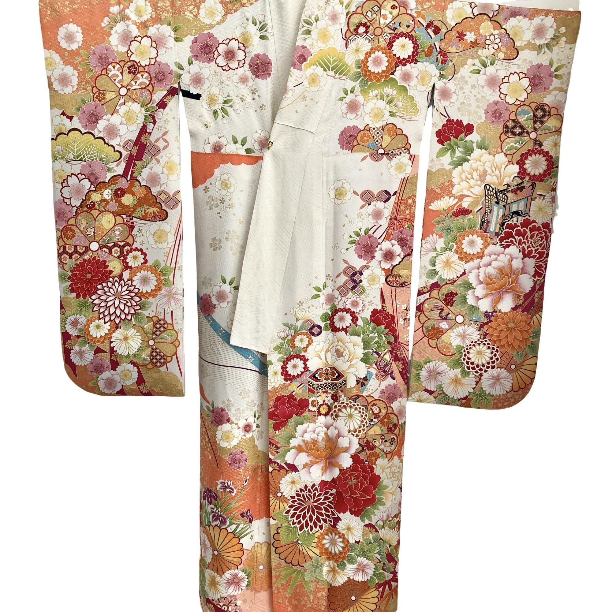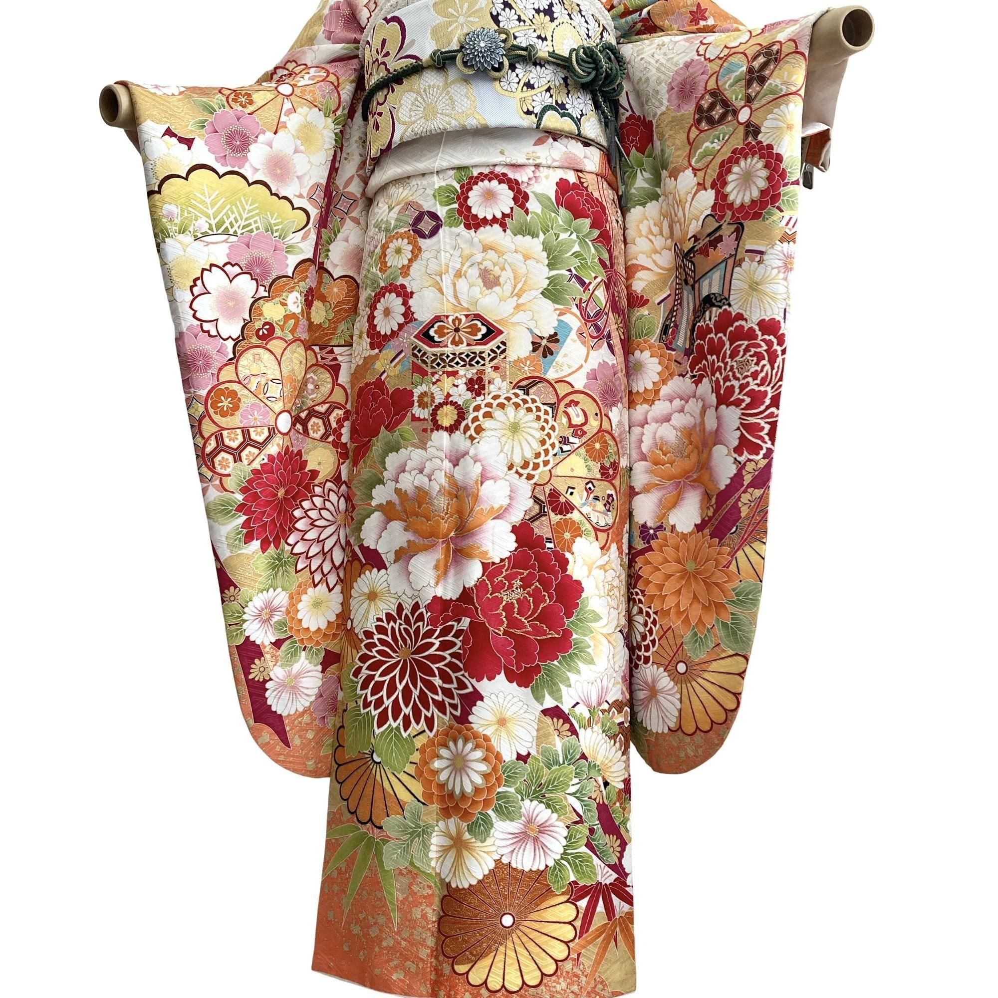 白とオレンジを基調に、牡丹や菊、宝尽くし、御所車などおめでたい文様を華やかにあしらった振袖です。