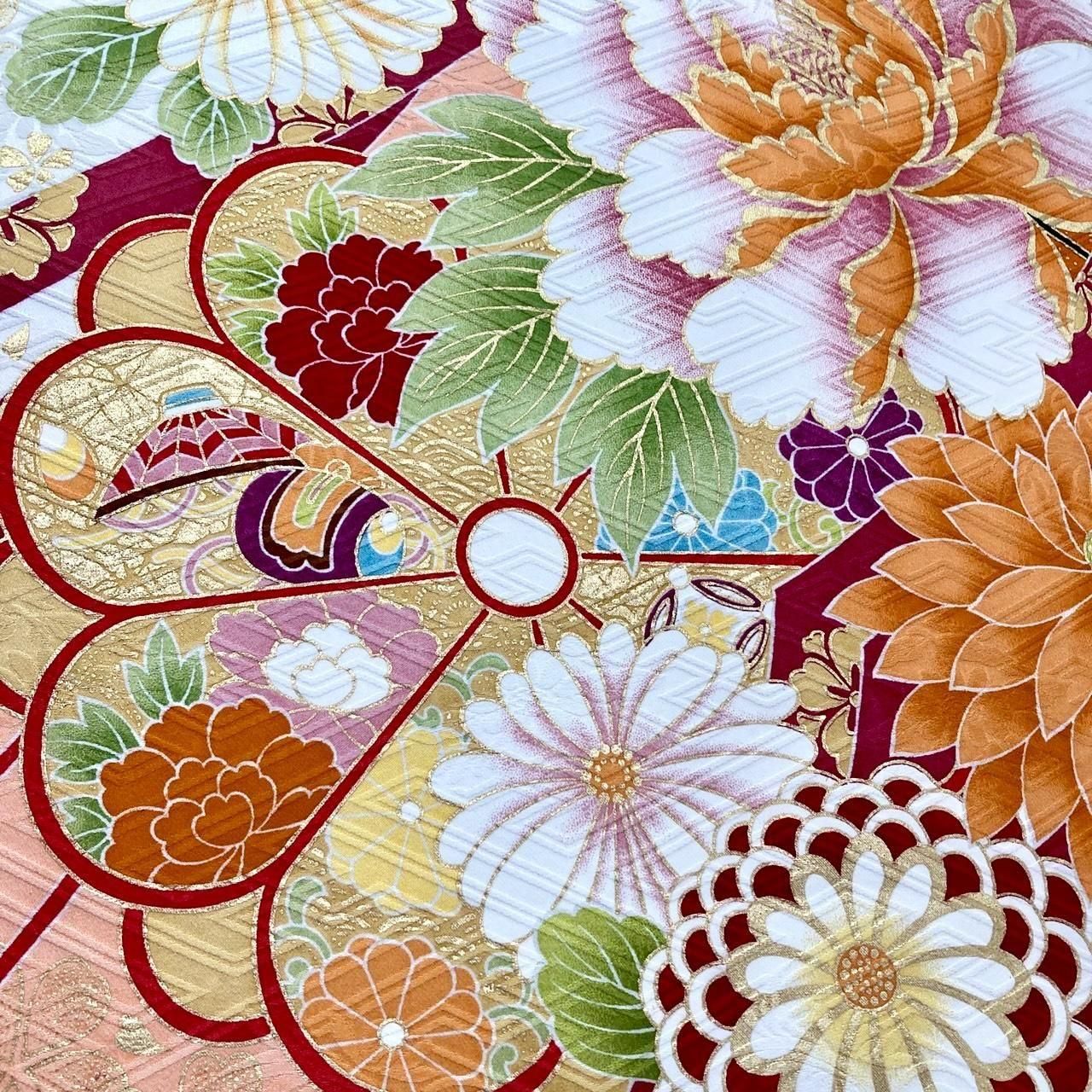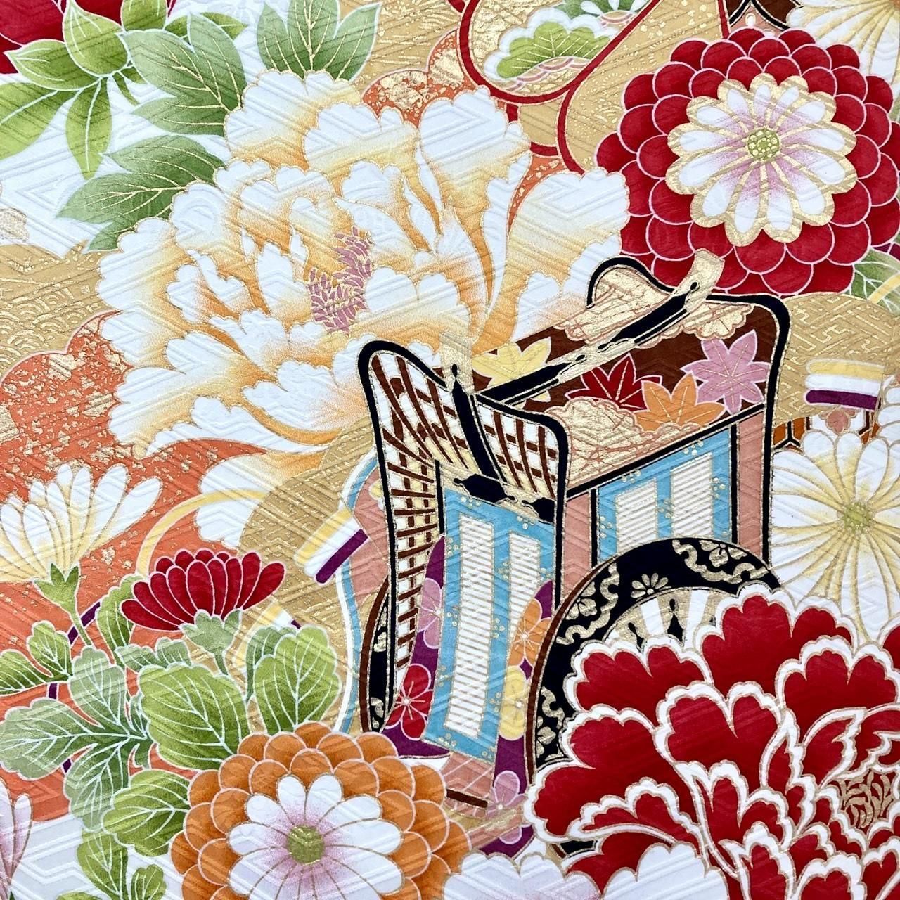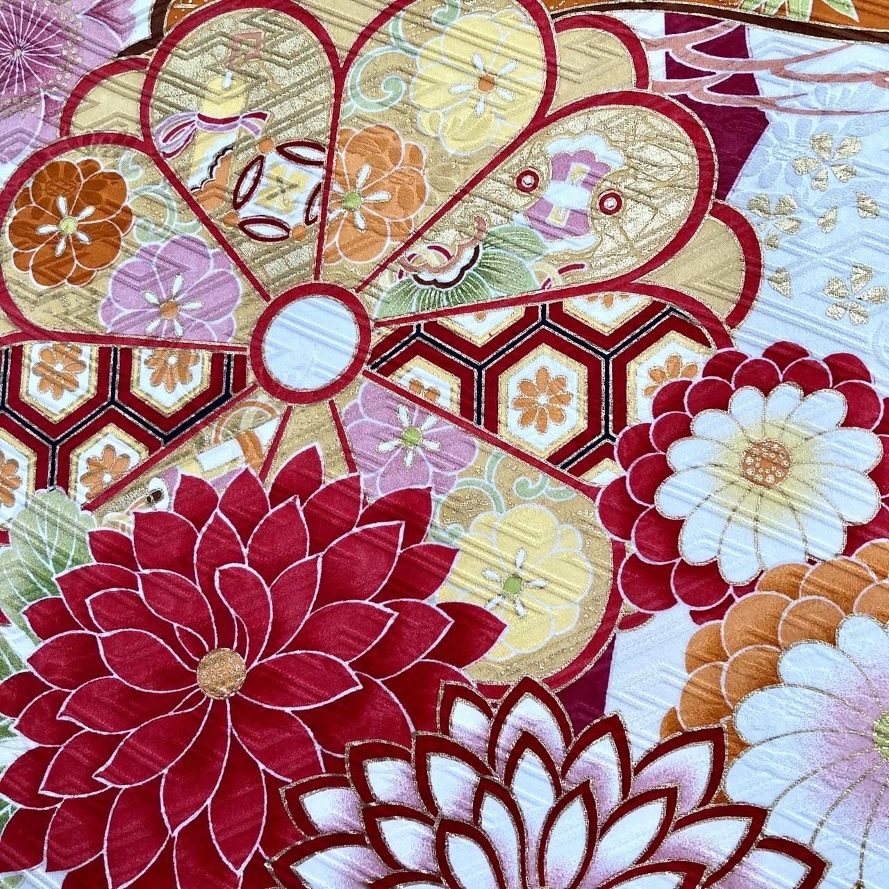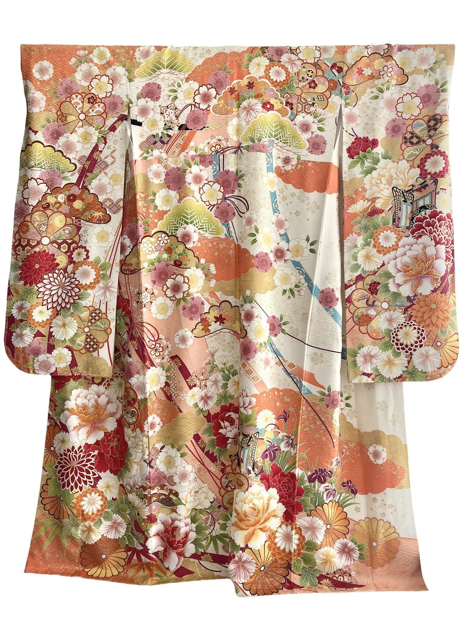 白とオレンジを基調に、牡丹や菊、宝尽くし、御所車などおめでたい文様を華やかにあしらった振袖です。